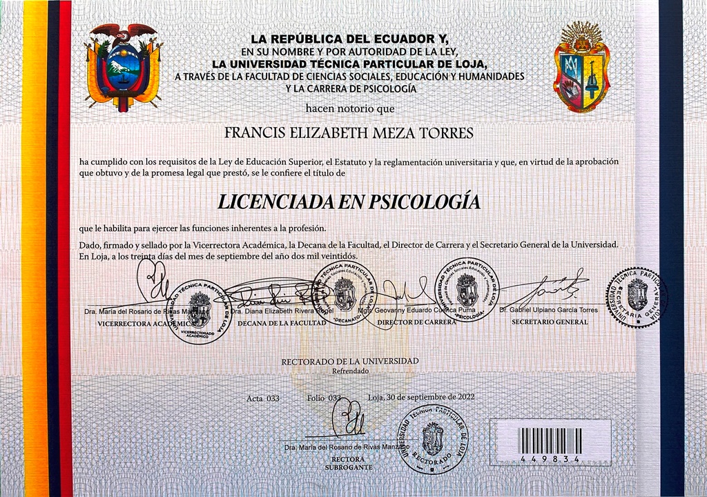 Máster en Neuropsicología Clínica. Psicóloga General. Coach con PNL. Ingeniera de sistemas informáticos. Coordinadora corporativa senior de procesos. Coordinadora de control, cumplimiento, riesgos e incidentes. Auditora senior de sistemas informáticos. Líder de instructores e instructora. Escritora. Investigadora. Redactora.