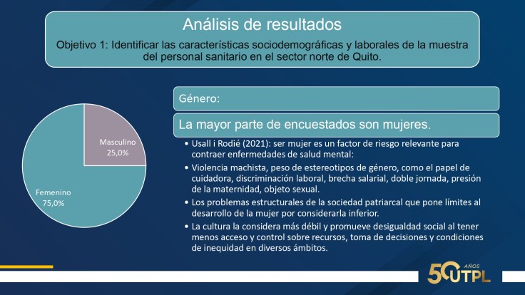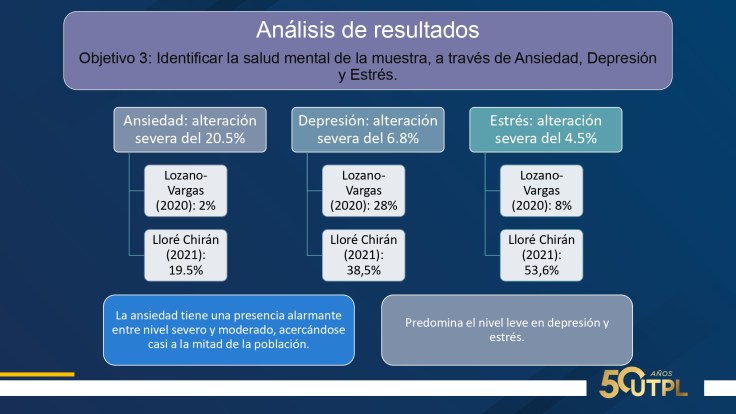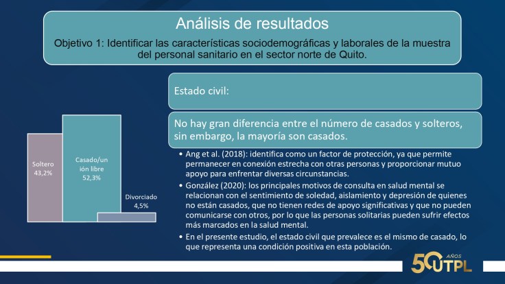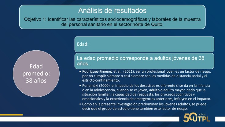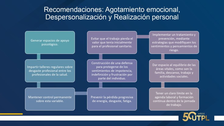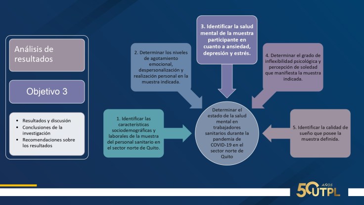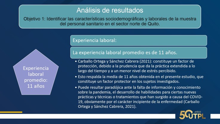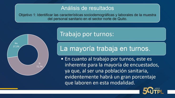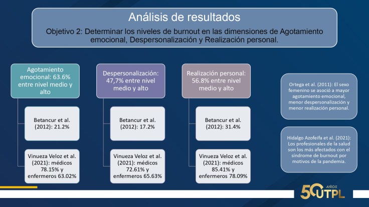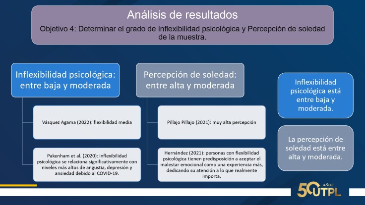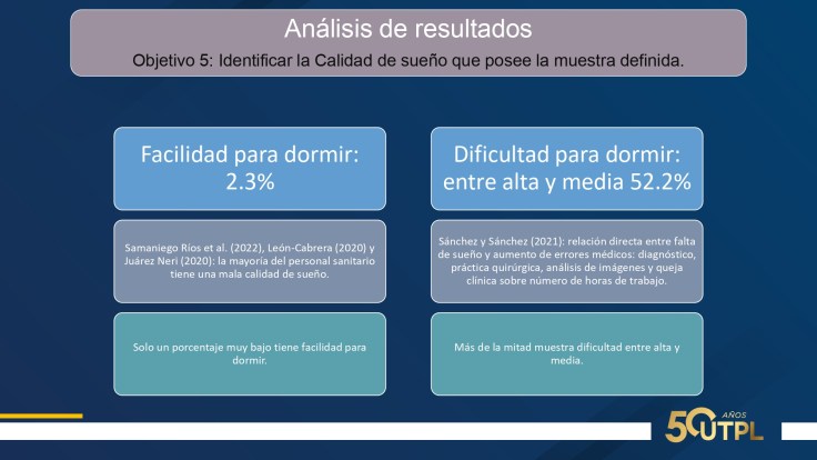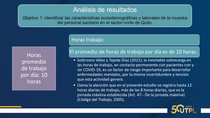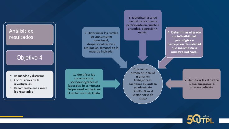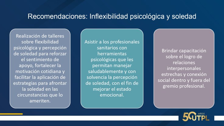 En cuanto a resultados: 75% mujeres, 52.3% casados, edad promedio 38 años, 72.7% trabaja por turnos, 93.2% a tiempo completo, una media de 10 horas diarias. Suman entre nivel medio y alto: agotamiento emocional, 63.6%; despersonalización, 47,7%; realización personal, 56.8%. Suman entre nivel severo y moderado: ansiedad 41%; depresión, 25% y estrés, 9%. Inflexibilidad psicológica entre baja y moderada; percepción de soledad entre alta y moderada. Calidad de sueño: facilidad para dormir, 2.3% y dificultad entre alta y media, 52.2%.