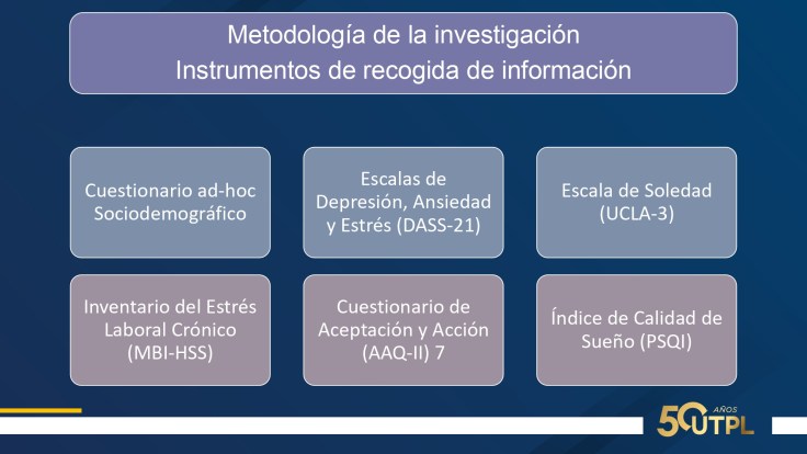 Se utilizan seis instrumentos: cuestionario ad-hoc Sociodemográfico, Inventario del Estrés Laboral Crónico (MBI-HSS), Escalas de Depresión, Ansiedad y Estrés (DASS-21), Cuestionario de Aceptación y Acción (AAQ-II) 7, Escala de Soledad (UCLA-3) e Índice de Calidad de Sueño (PSQI).